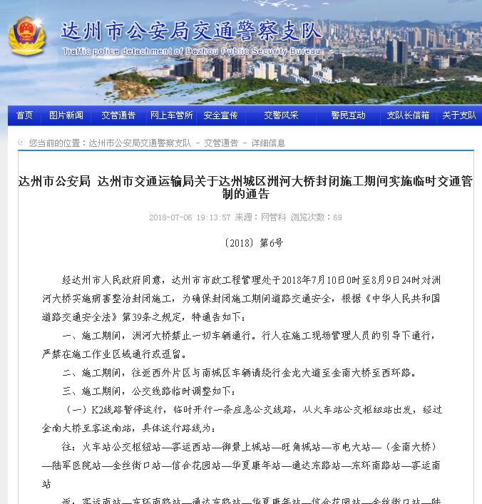 經(jīng)達州市人民政府同意,達州市市政工程管理處于2018年7月10日0時至8月9日24時對洲河大橋?qū)嵤┎『φ畏忾]施工,為確保封閉施工期間道路交通安全,根據(jù)《中華人民共和國道路交通安全法》第39條之規(guī)定,特通告如下: